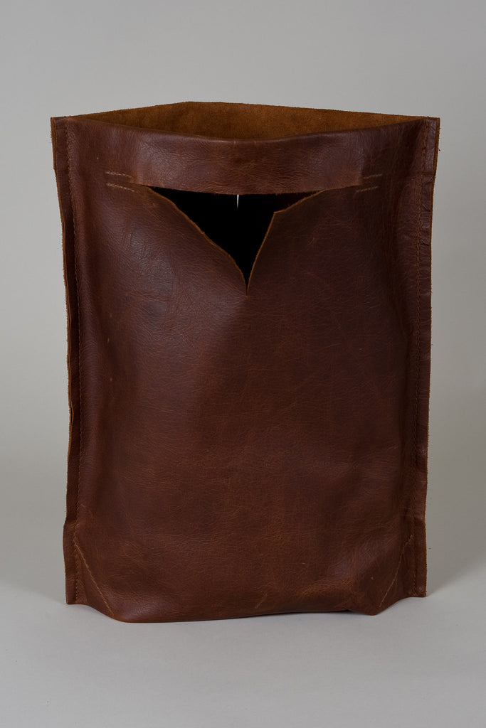 Slechts een ruwe uitsnede in het robuuste leer zorgt er voor dat je de tas kunt dragen. Het leer is grotendeels onbewerkt, waardoor de originele structuur goed zichtbaar blijft.