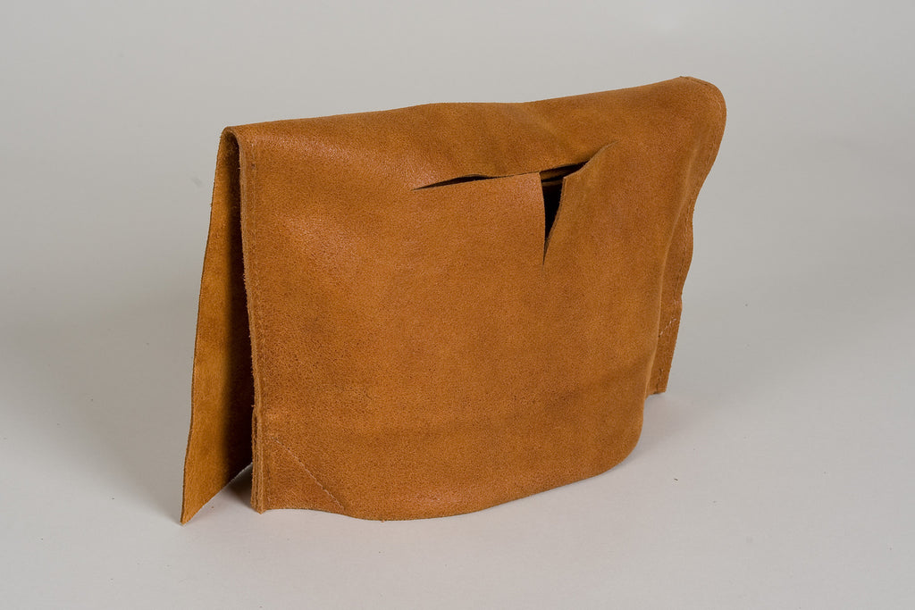 Slechts een ruwe uitsnede in het robuuste leer zorgt er voor dat je de tas kunt dragen. Het leer is grotendeels onbewerkt, waardoor de originele structuur goed zichtbaar blijft.