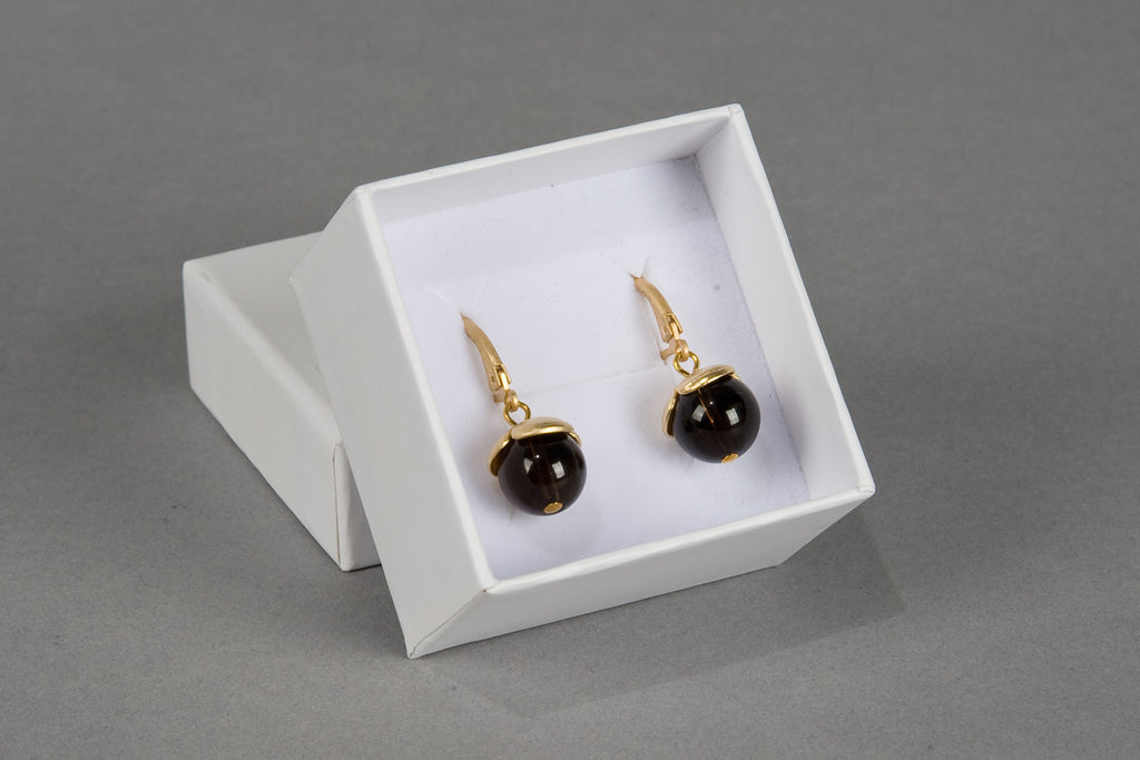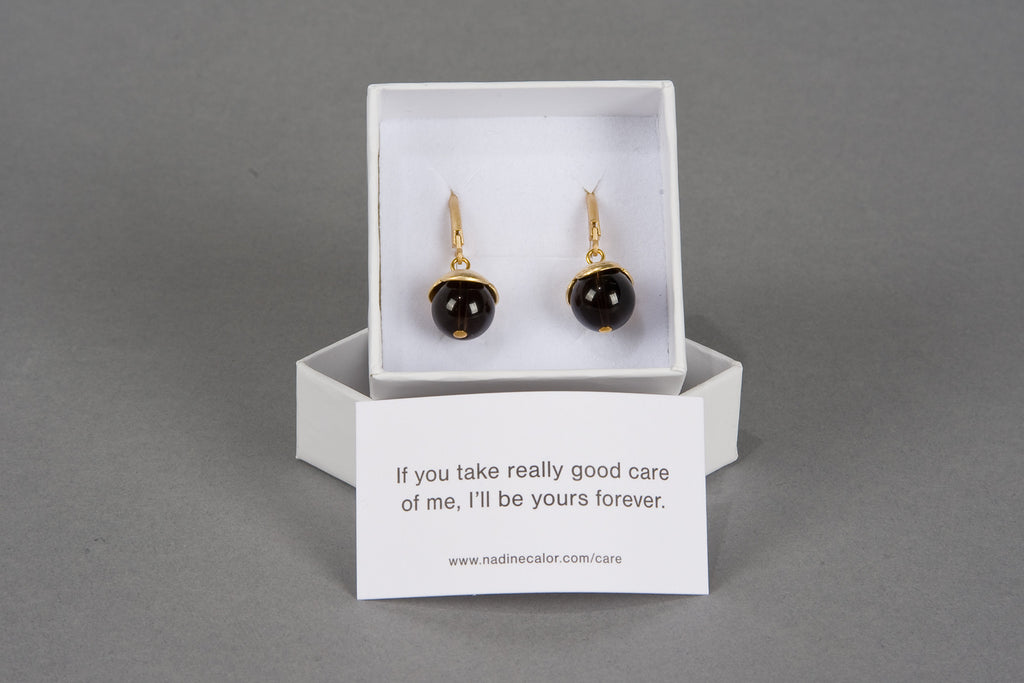 Adorable matte gold-tone flower petals with dark brown Smoky Quartz drops hanging from leverback earwires. Wear these pretty earrings with swept-up hair for an ultra feminine look. These are natural gemstones and may vary slightly in color & size. This piece is Nickel free. For reasons of hygiene, earrings cannot be exchanged unless they are faulty.