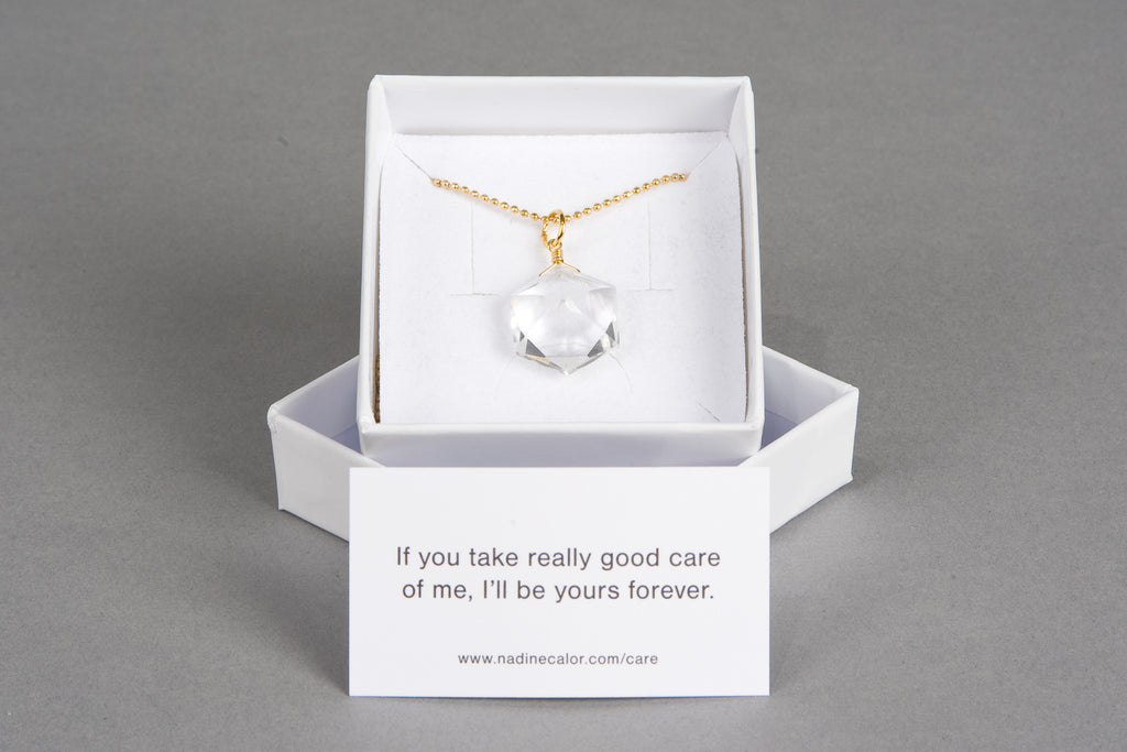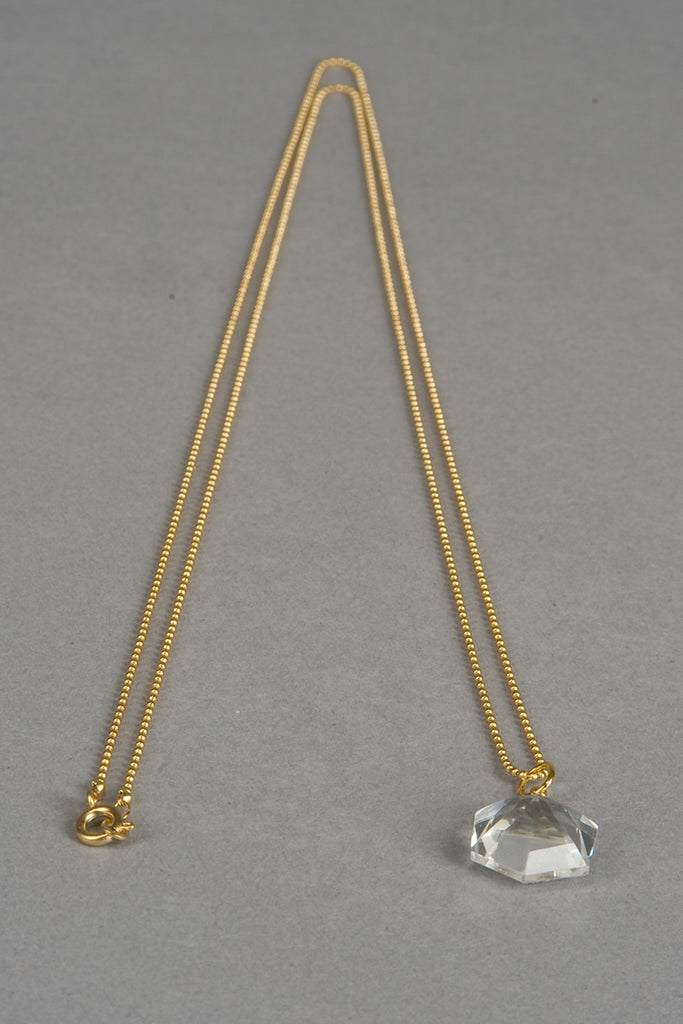Long matte gold tone necklace with a gorgeous hexagon shaped Rock Crystal gemstone pendant. This is a long necklace to be worn over your clothes. This is a natural gemstone and may vary slightly in color & size. This piece is Nickel free.