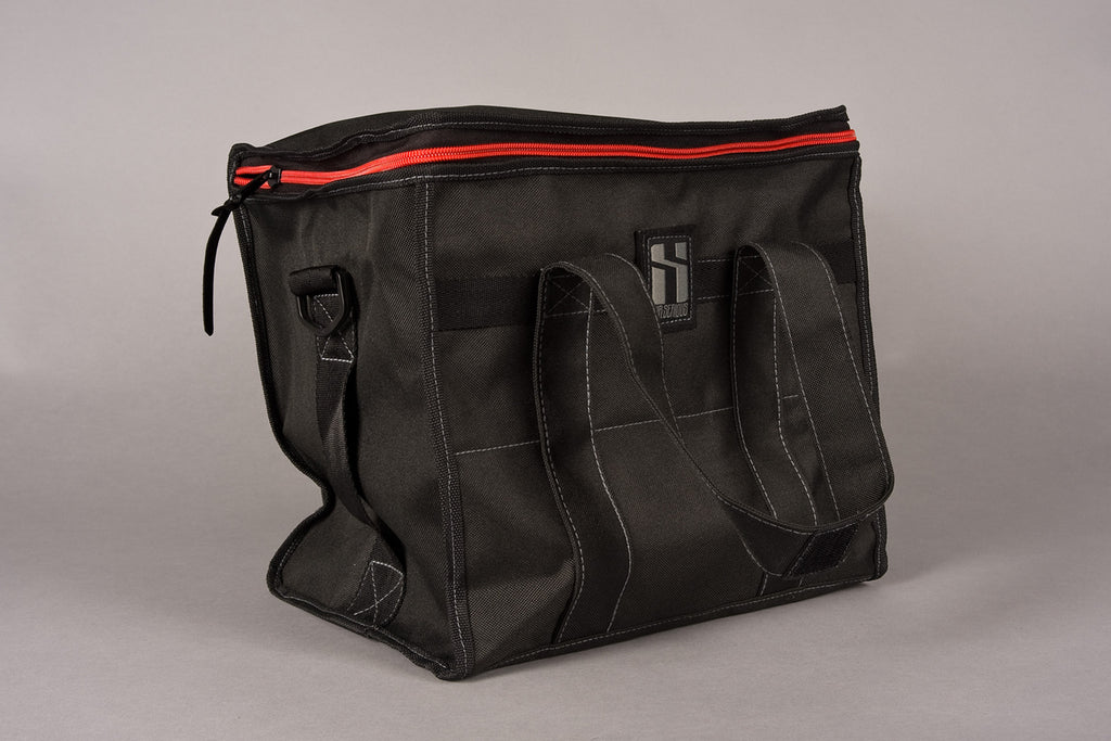 Reason to use: Holds 12 spray cans, cans won’t tip over if carton boxes are used, bag is discrete black, can be closed with zipper and has hand carry straps with velcro and shoulder strap.