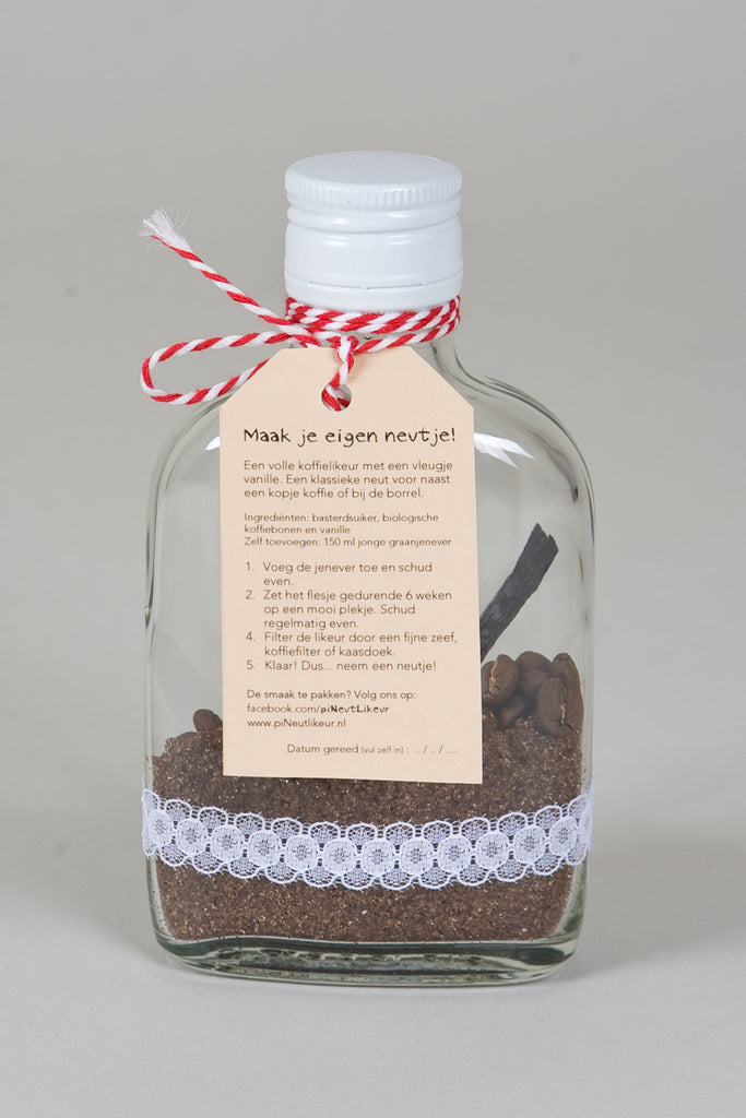 Maak je eigen neutje! piNeut maakt pakketten waarmee je thuis de lekkerste likeurtjes kunt maken. Een volle koffielikeur met een vleugje vanille. Een klassiek neutje dat het altijd goed doet. Fles 750ml
